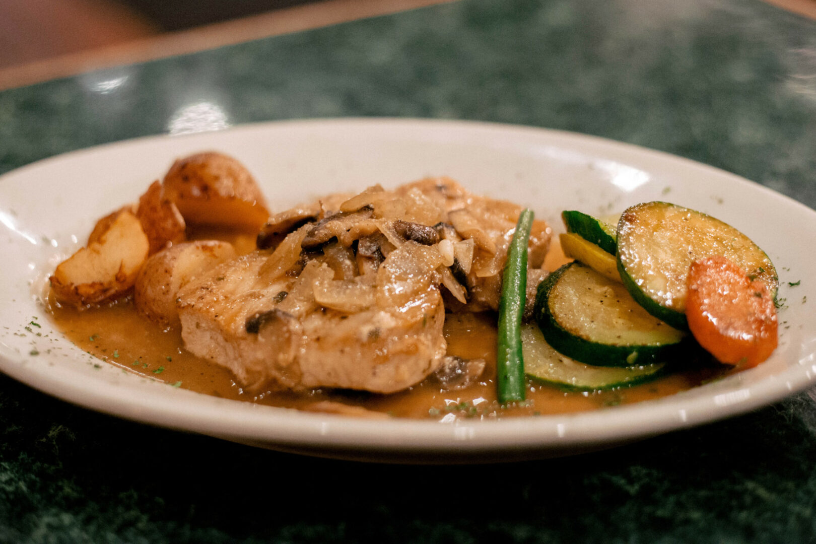 Pan-seared, 12oz picatta-style veal chop, served with a side of spaghetti in olive oil, garlic and green beans.